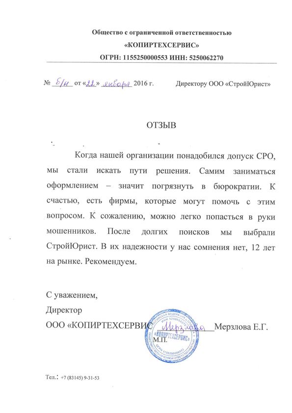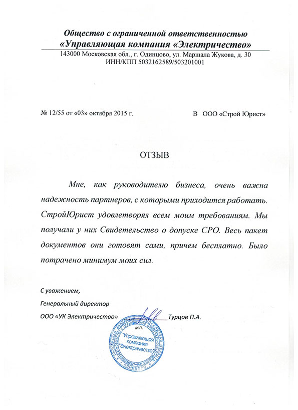 Отзывы клиентов "СтройЮрист" по вступлению в СРО в Электростали